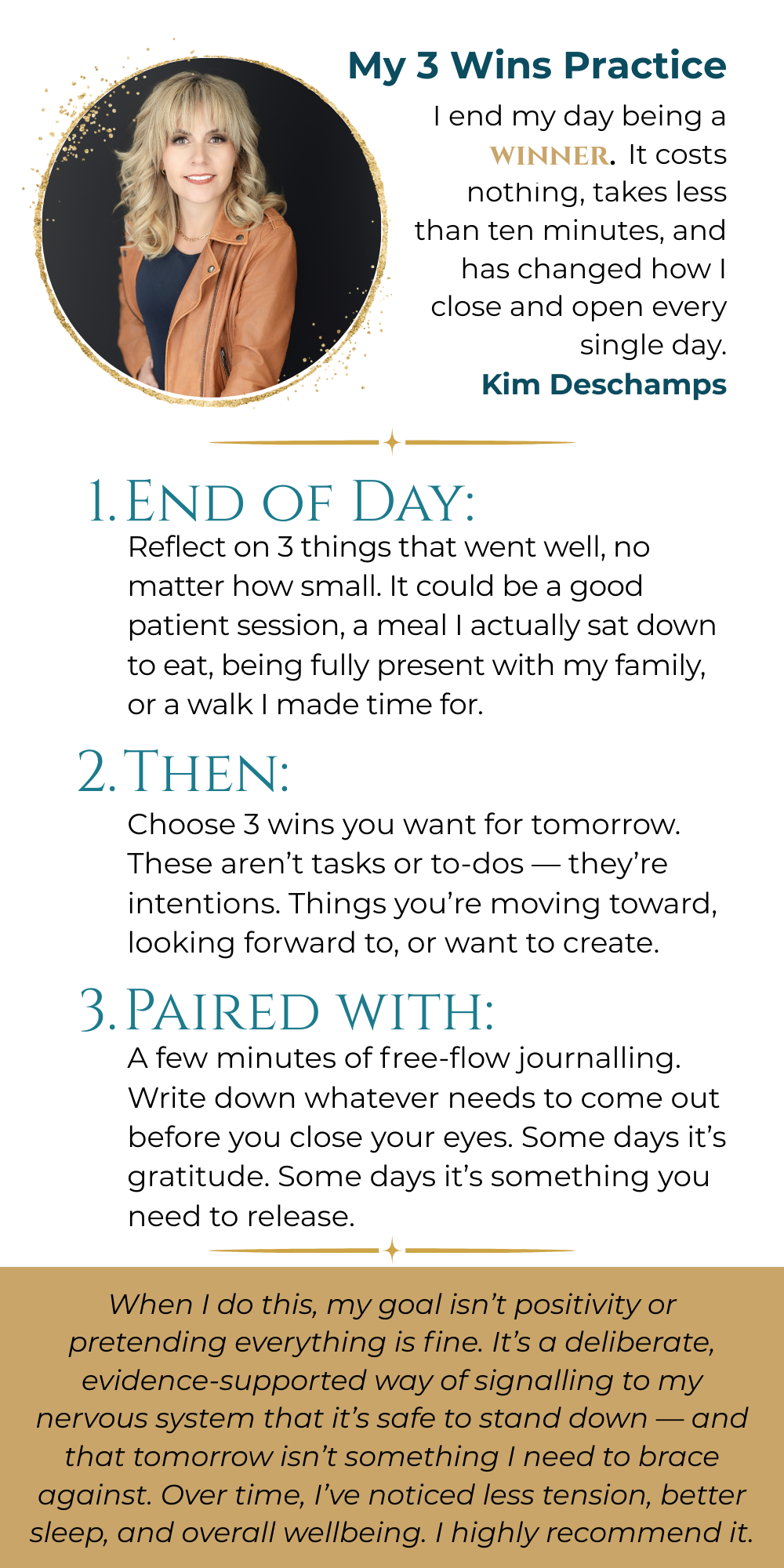 Journaling is a meaningful and evidence-supported tool. I’m sharing my personal “3 Wins Practice” here because it’s something I use myself.
